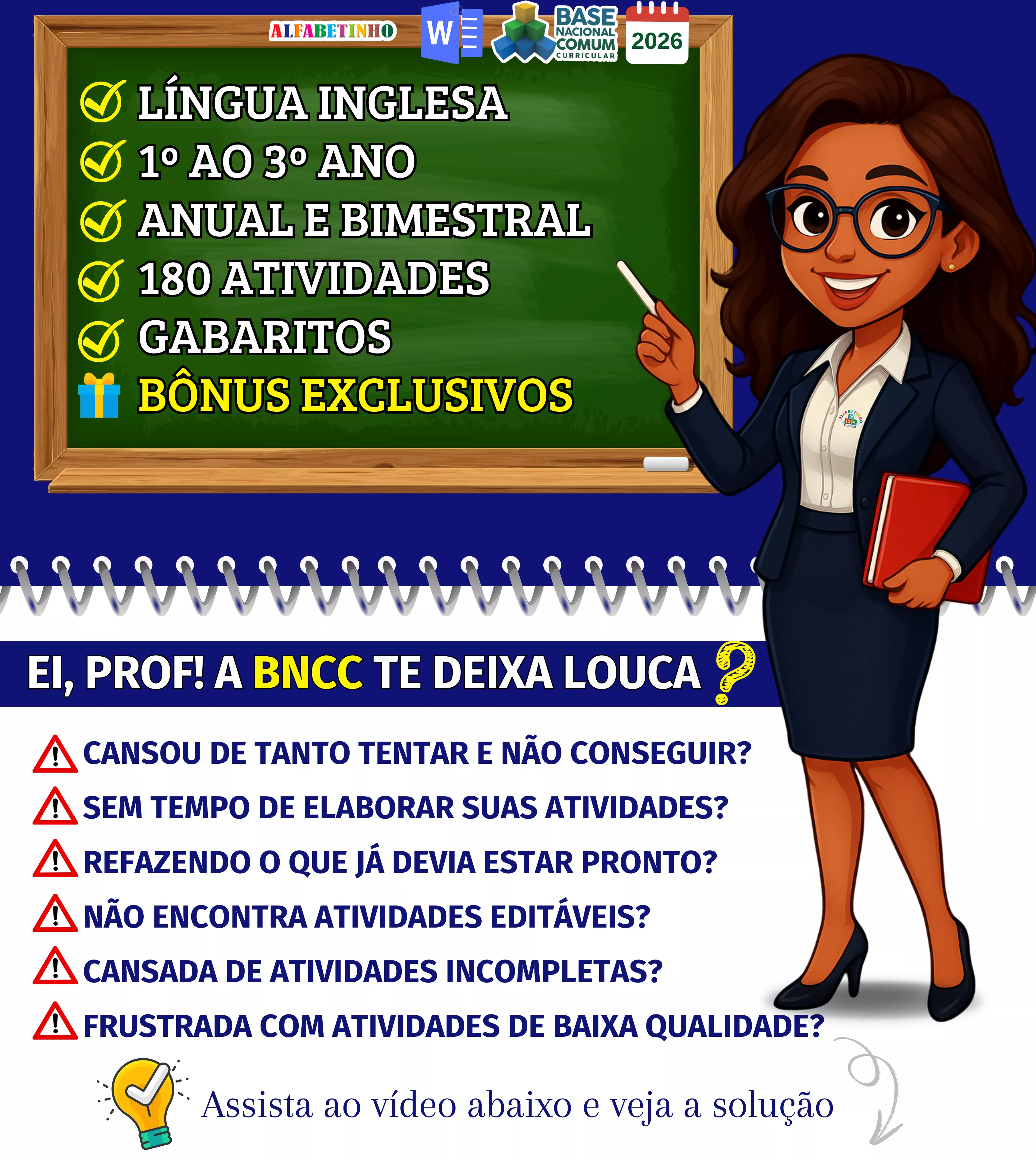Atividades anuais e bimestrais completas, atualizadas conforme a BNCC 2026, totalmente editáveis no Word e adaptáveis à sua realidade escolar. Praticidade, qualidade e inspiração para professores que amam ensinar!