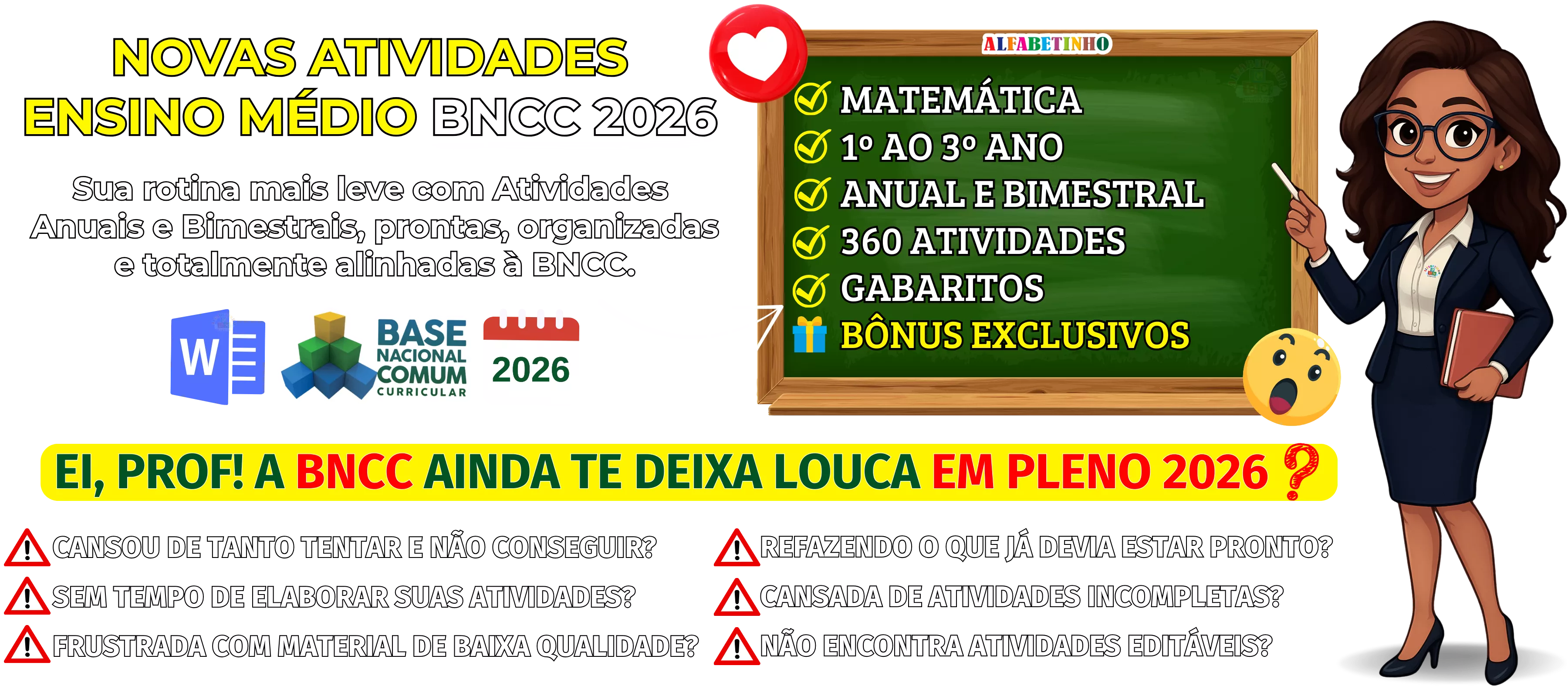 Atividades anuais e bimestrais completas, atualizadas conforme a BNCC 2026, totalmente editáveis no Word e adaptáveis à sua realidade escolar. Praticidade, qualidade e inspiração para professores que amam ensinar!