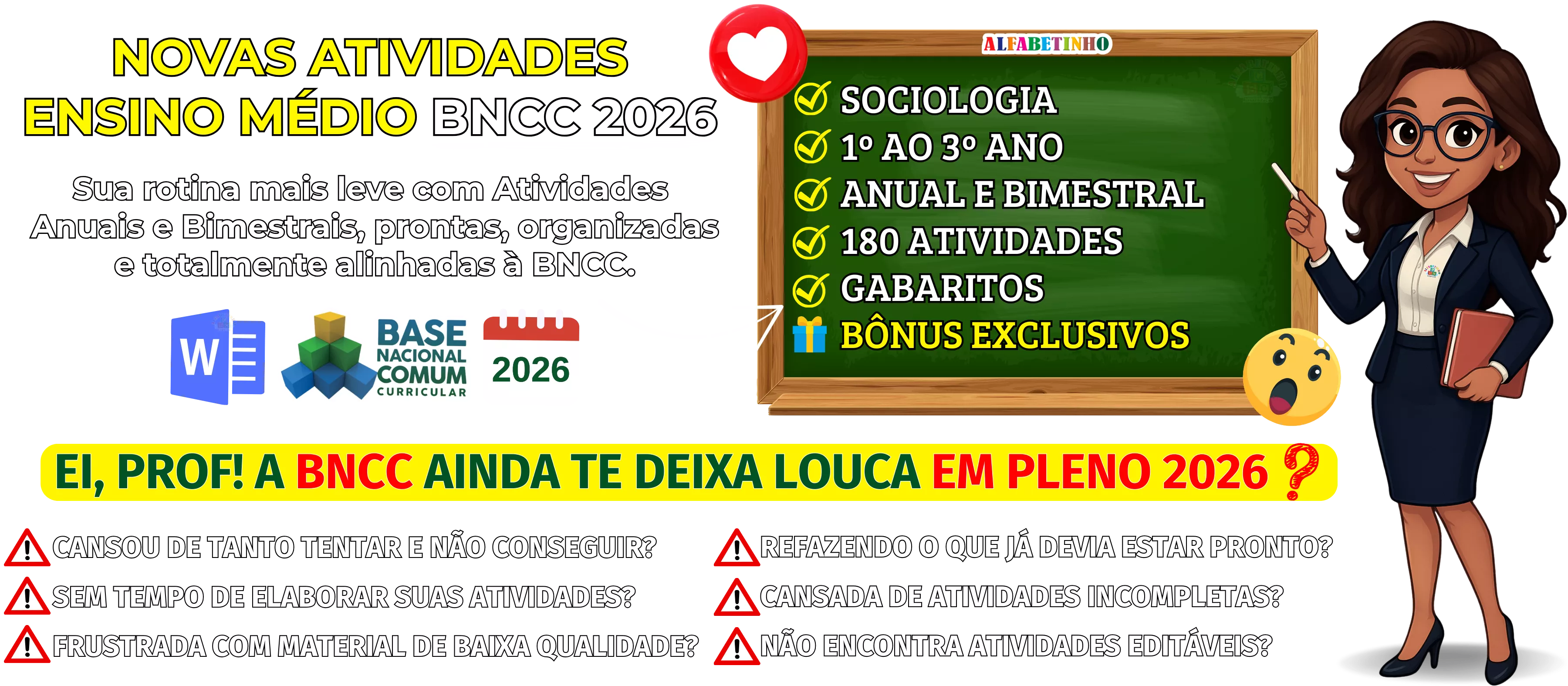 Atividades anuais e bimestrais completas, atualizadas conforme a BNCC 2026, totalmente editáveis no Word e adaptáveis à sua realidade escolar. Praticidade, qualidade e inspiração para professores que amam ensinar!