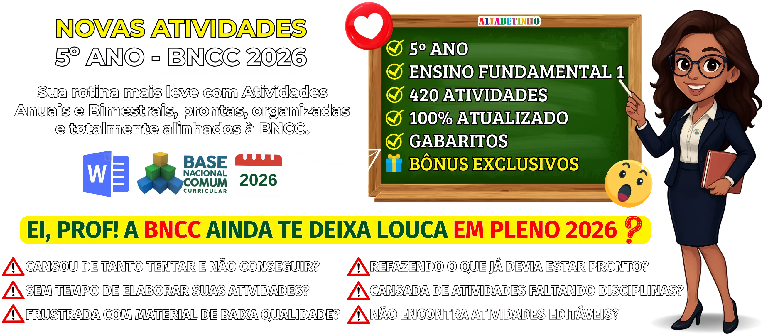 Atividades anuais e bimestrais completos, atualizados conforme a BNCC 2026, totalmente editáveis no Word e adaptáveis à sua realidade escolar. Praticidade, qualidade e inspiração para professores que amam ensinar!