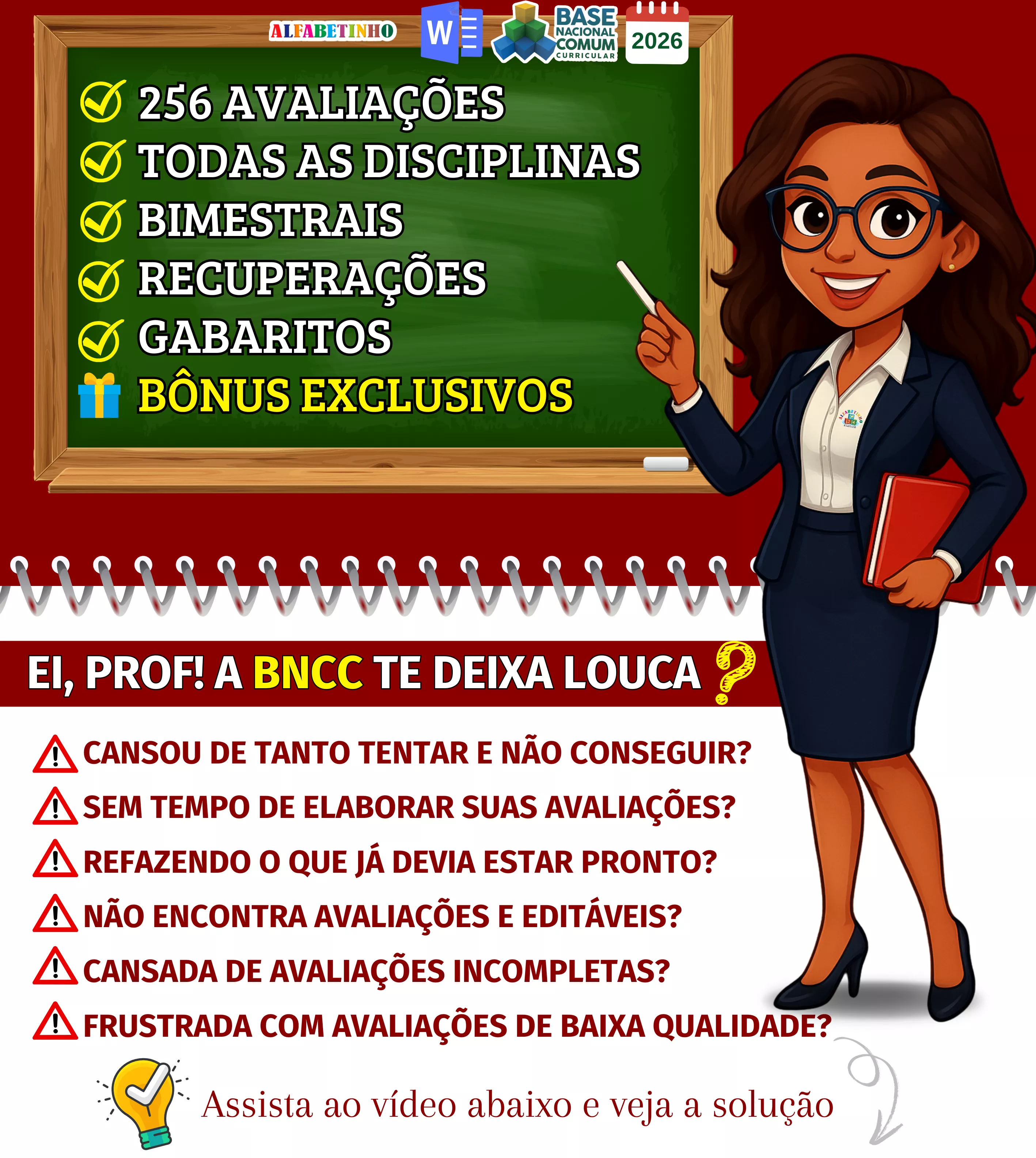 Avaliações completas, atualizadas conforme a BNCC 2026, totalmente editáveis no Word e adaptáveis à sua realidade escolar. Praticidade, qualidade e inspiração para professores que amam ensinar!