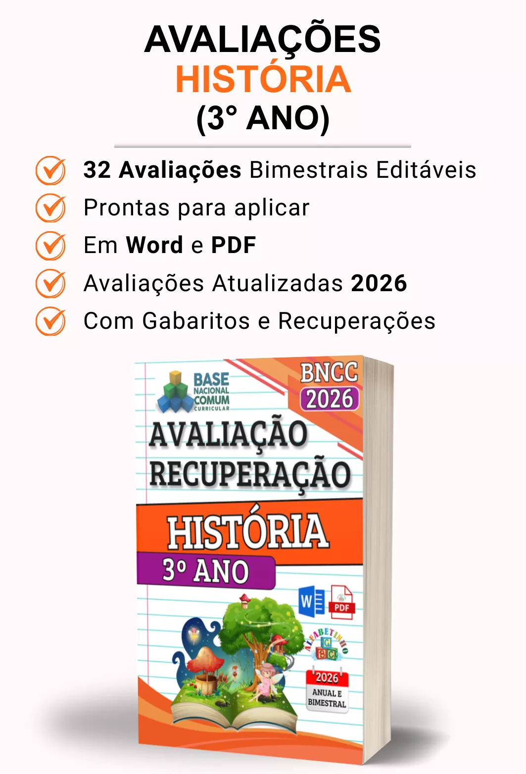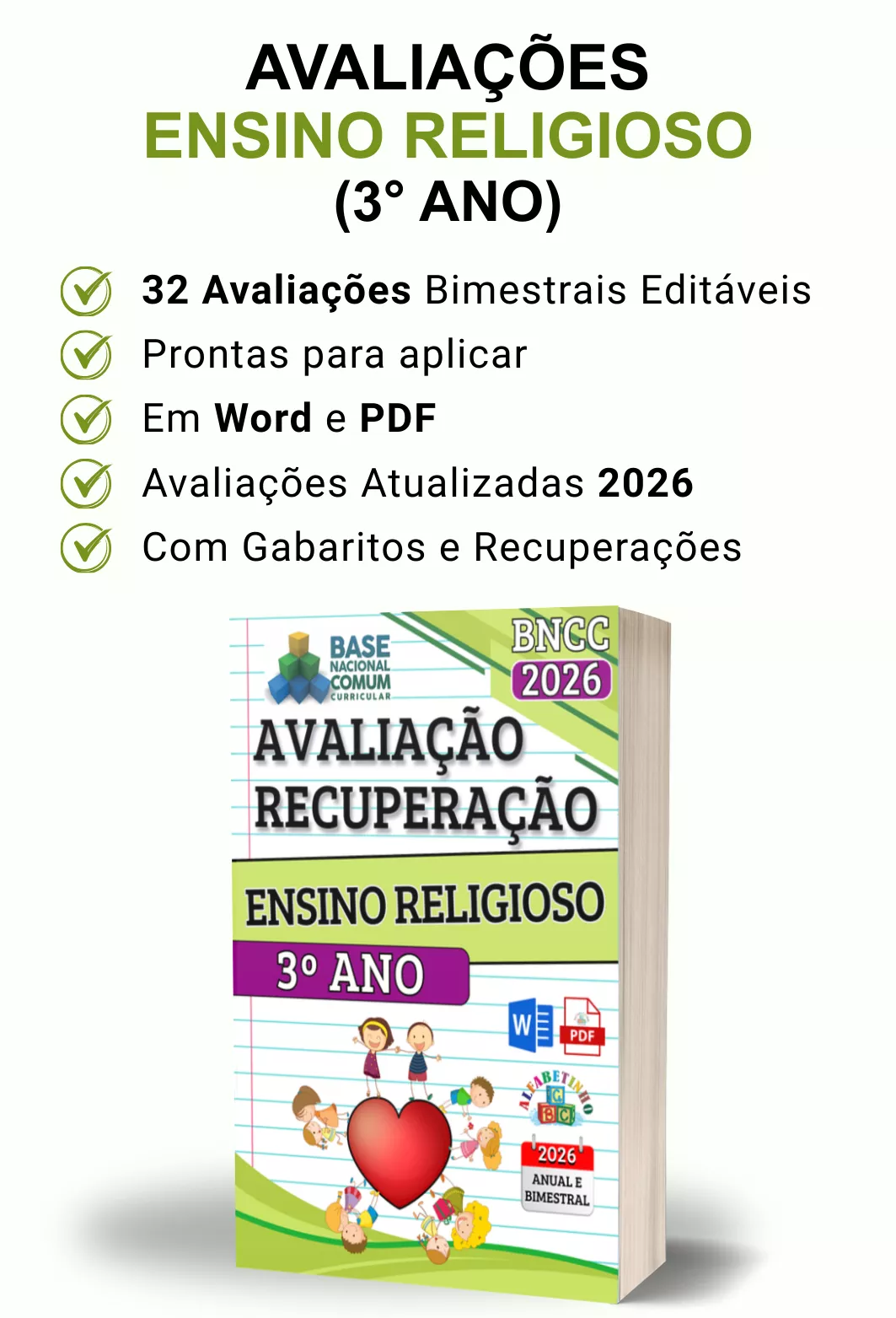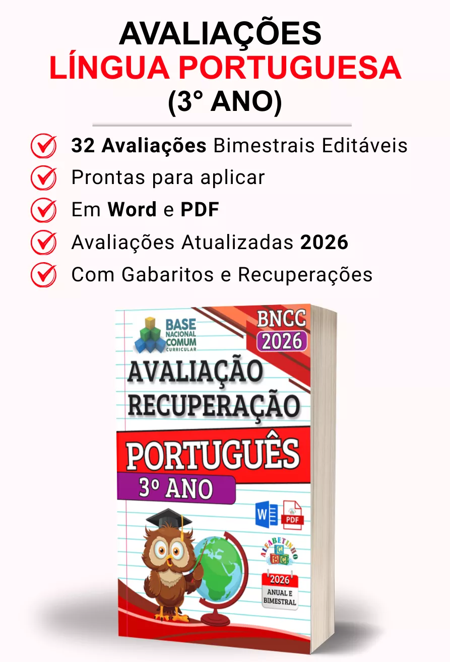Avaliações completas, atualizadas conforme a BNCC 2026, totalmente editáveis no Word e adaptáveis à sua realidade escolar. Praticidade, qualidade e inspiração para professores que amam ensinar!