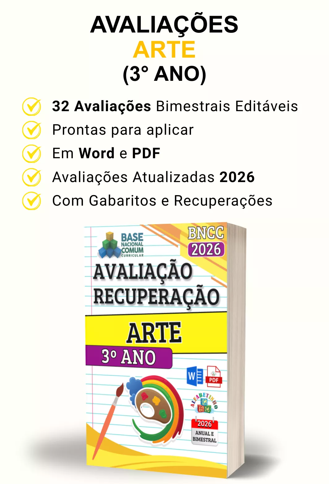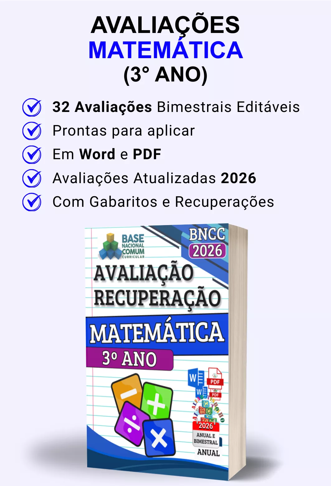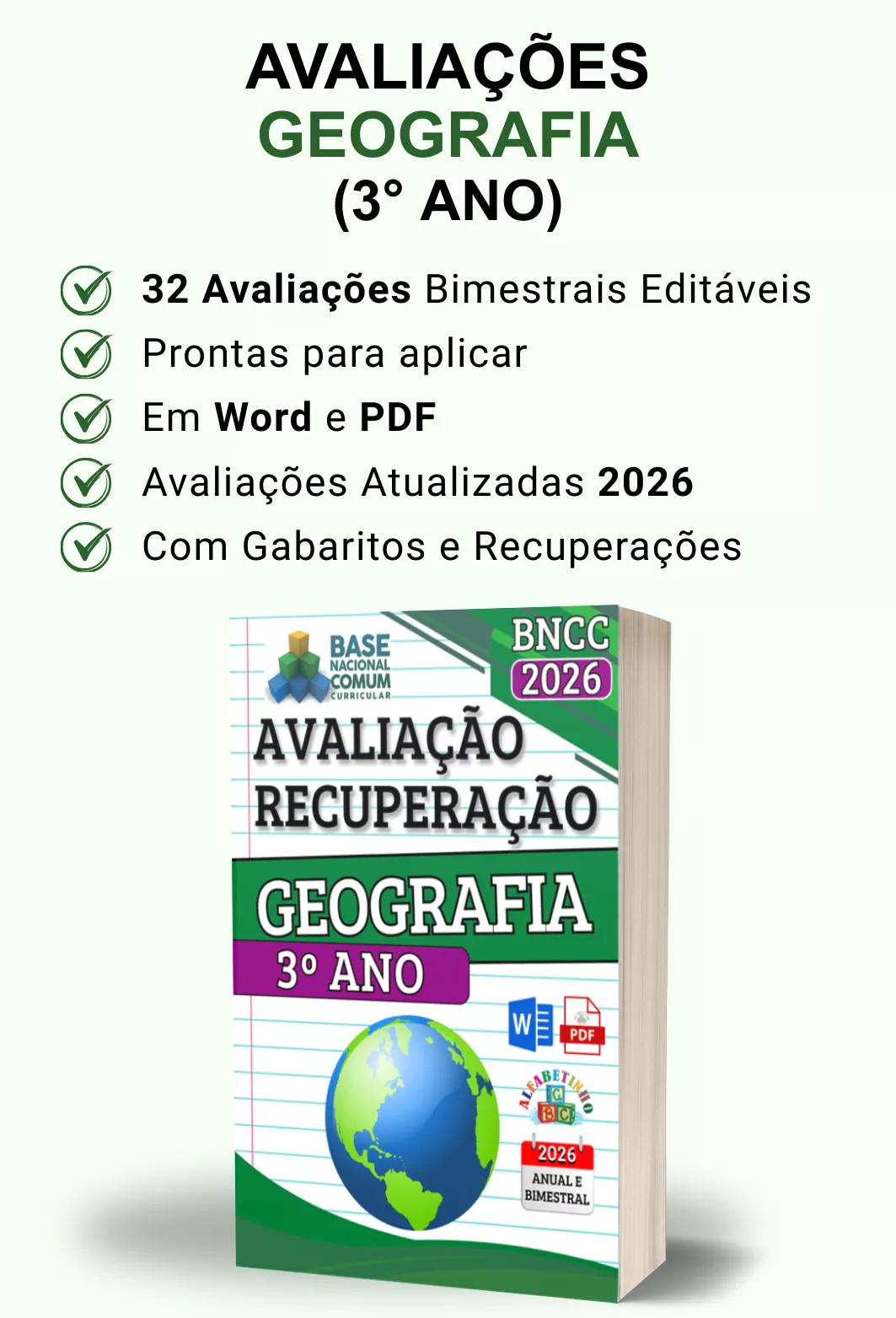 Avaliações completas, atualizadas conforme a BNCC 2026, totalmente editáveis no Word e adaptáveis à sua realidade escolar. Praticidade, qualidade e inspiração para professores que amam ensinar!