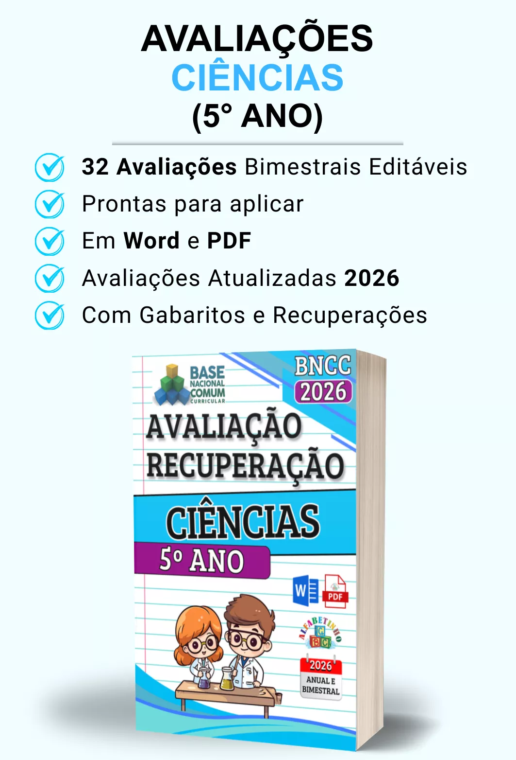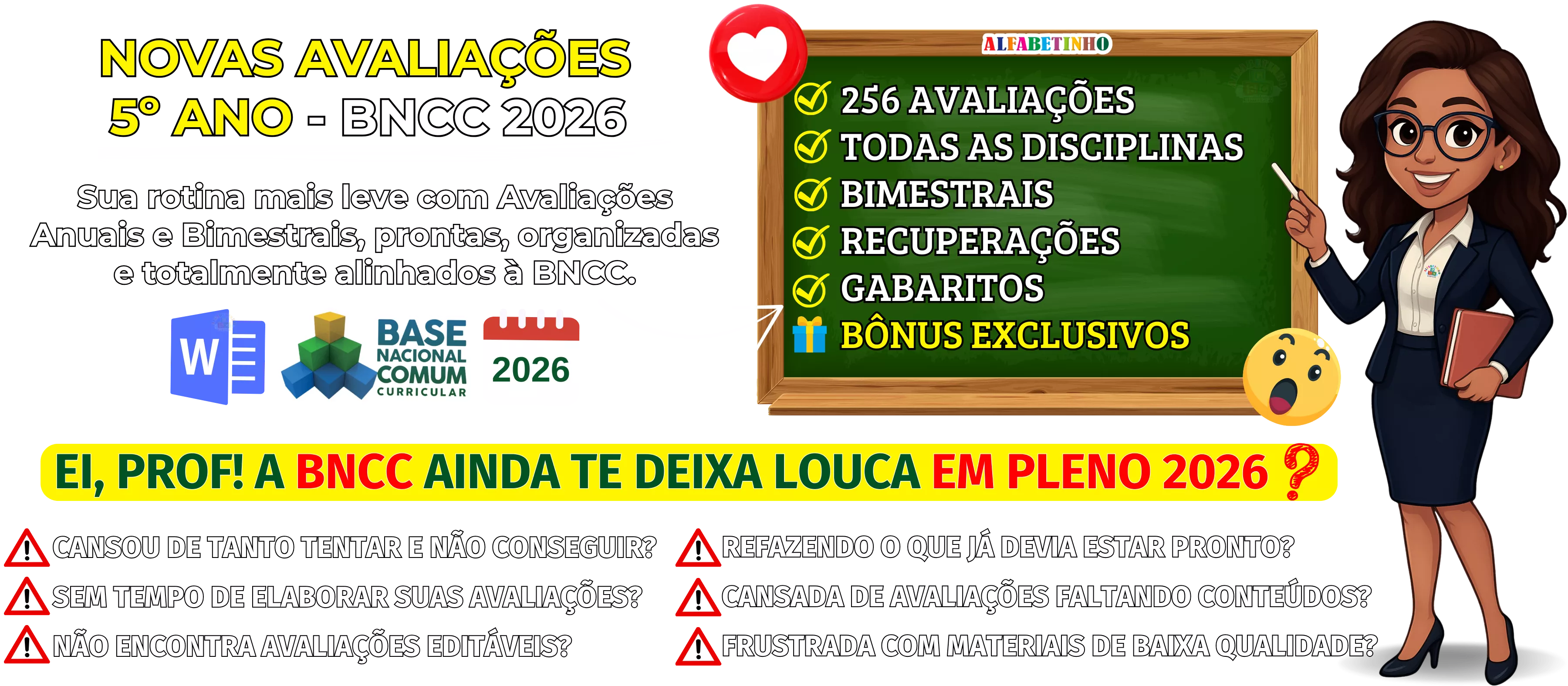 Avaliações completas, atualizadas conforme a BNCC 2026, totalmente editáveis no Word e adaptáveis à sua realidade escolar. Praticidade, qualidade e inspiração para professores que amam ensinar!