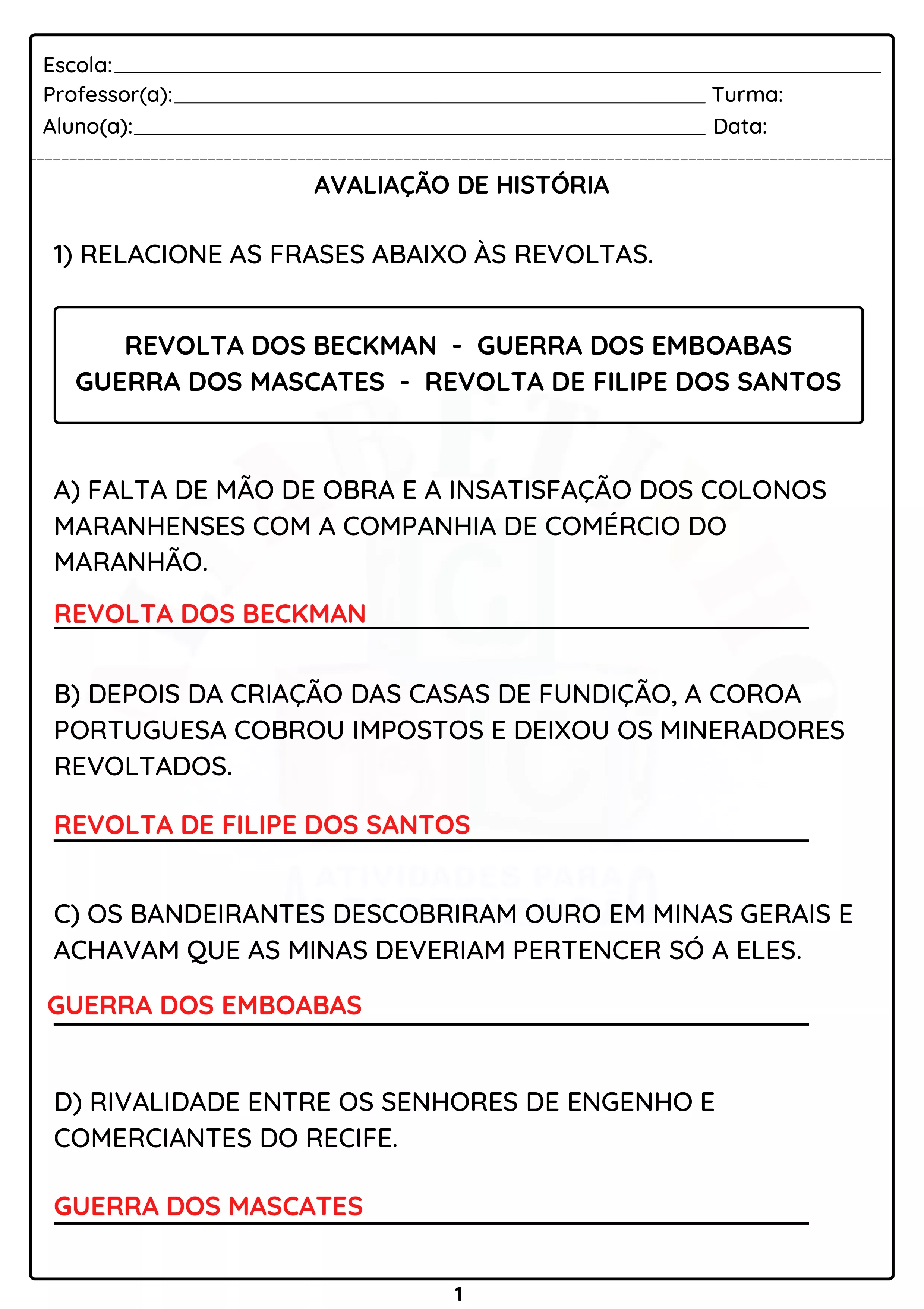 EXEMPLOS DE AVALIAÇÕES: