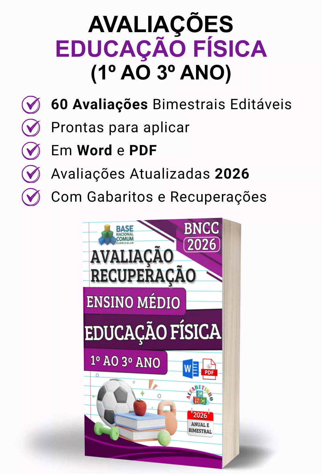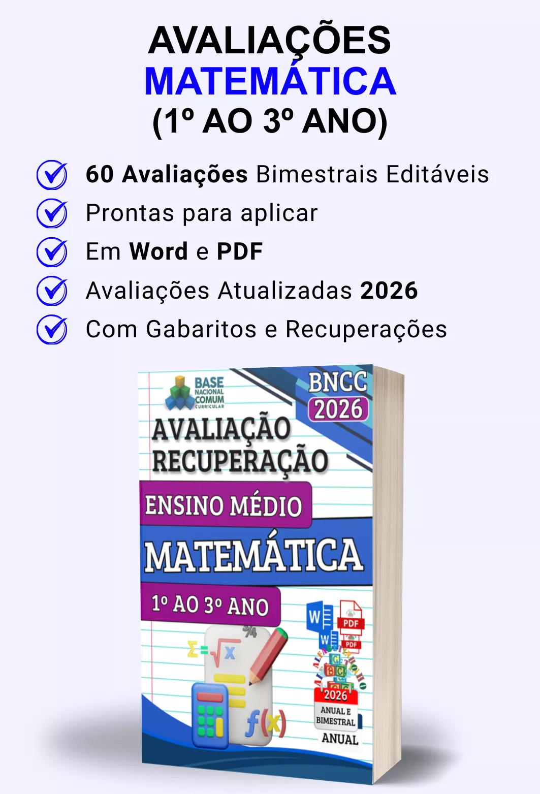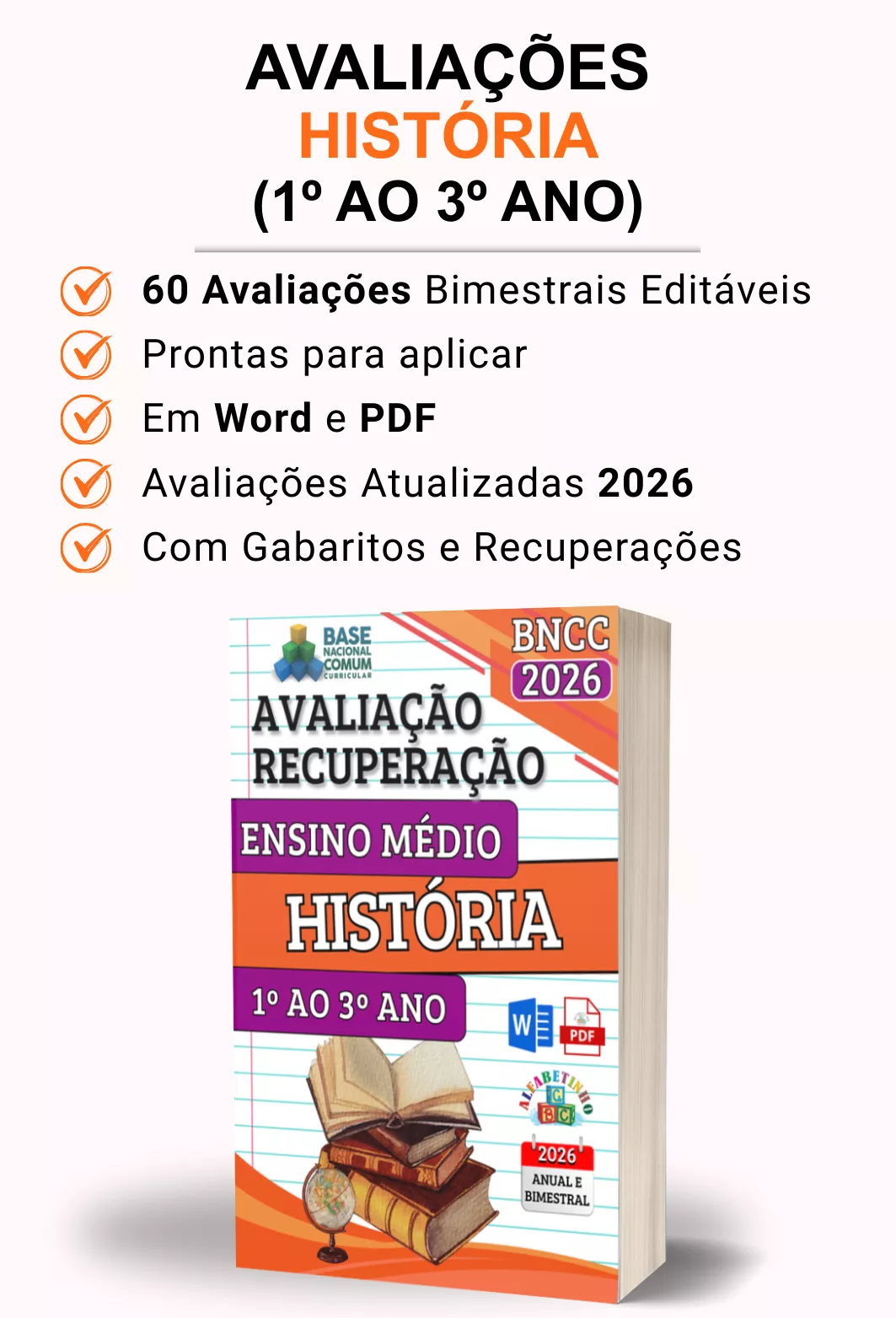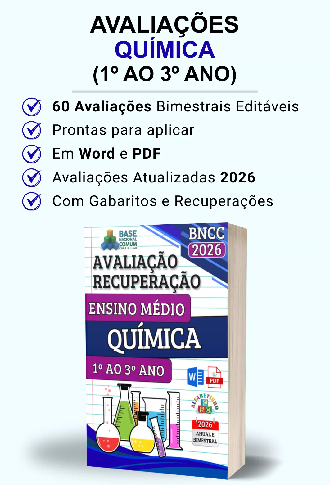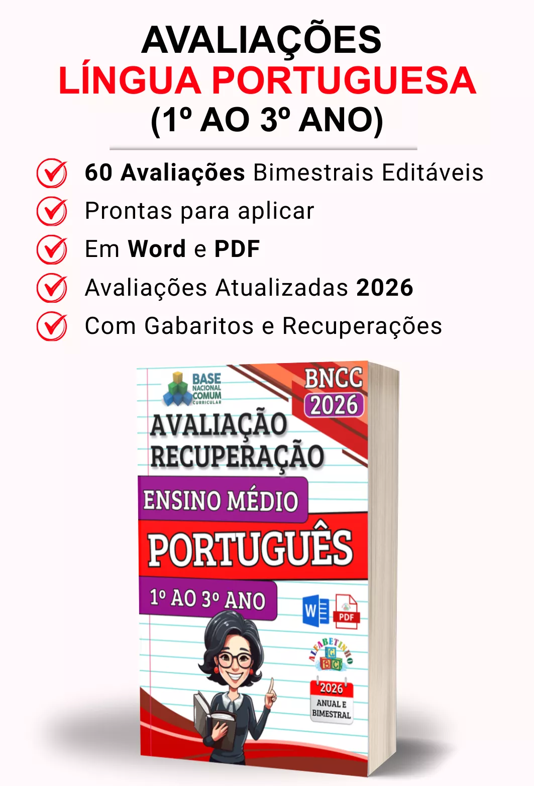 Avaliações completas, atualizadas conforme a BNCC 2026, totalmente editáveis no Word e adaptáveis à sua realidade escolar. Praticidade, qualidade e inspiração para professores que amam ensinar!