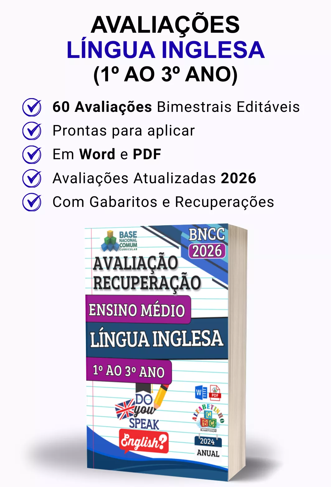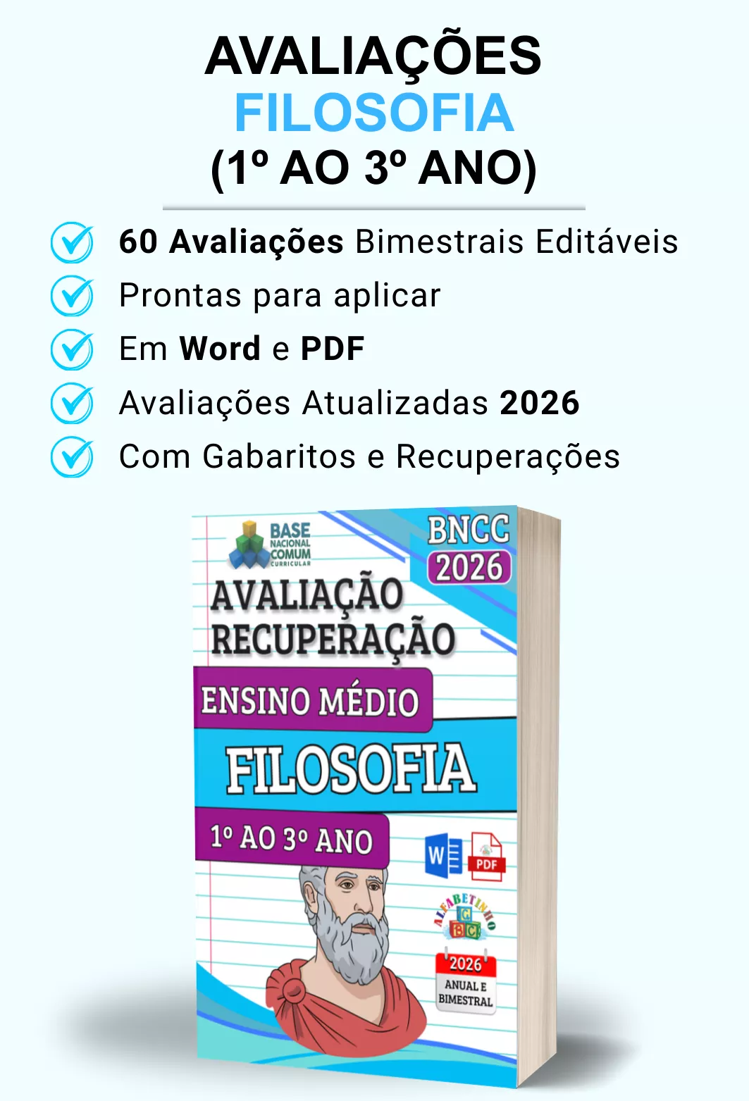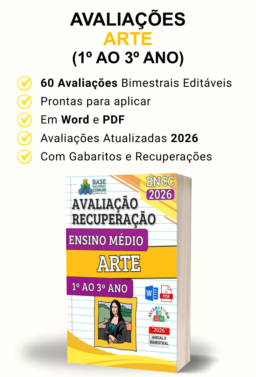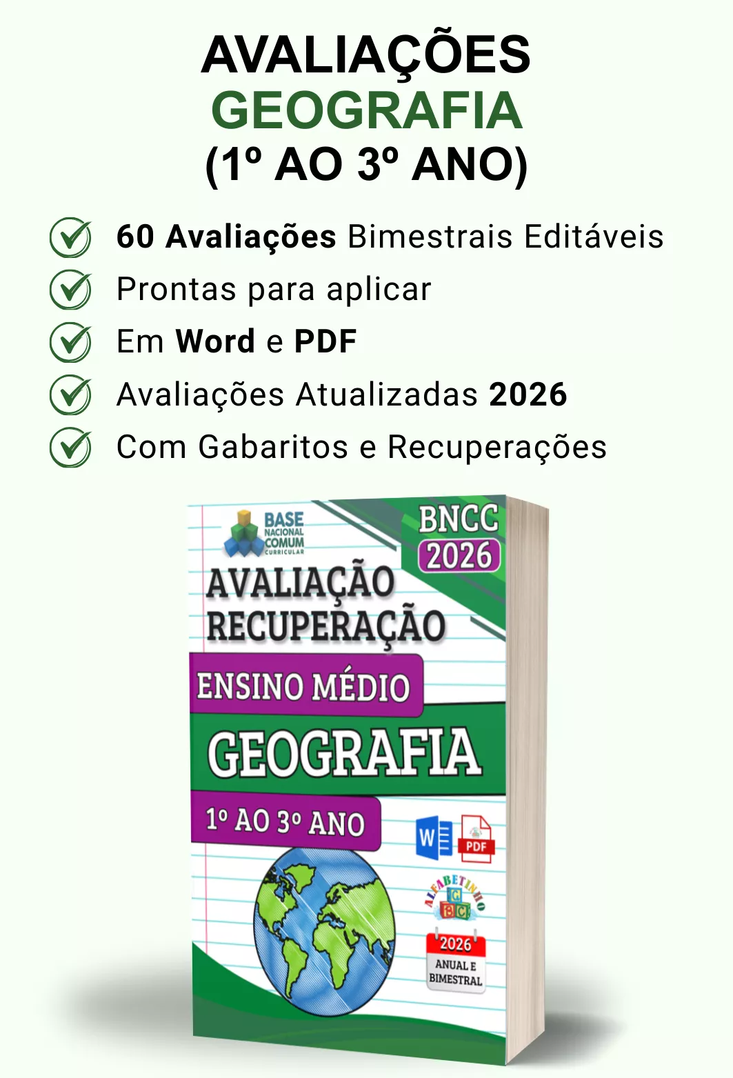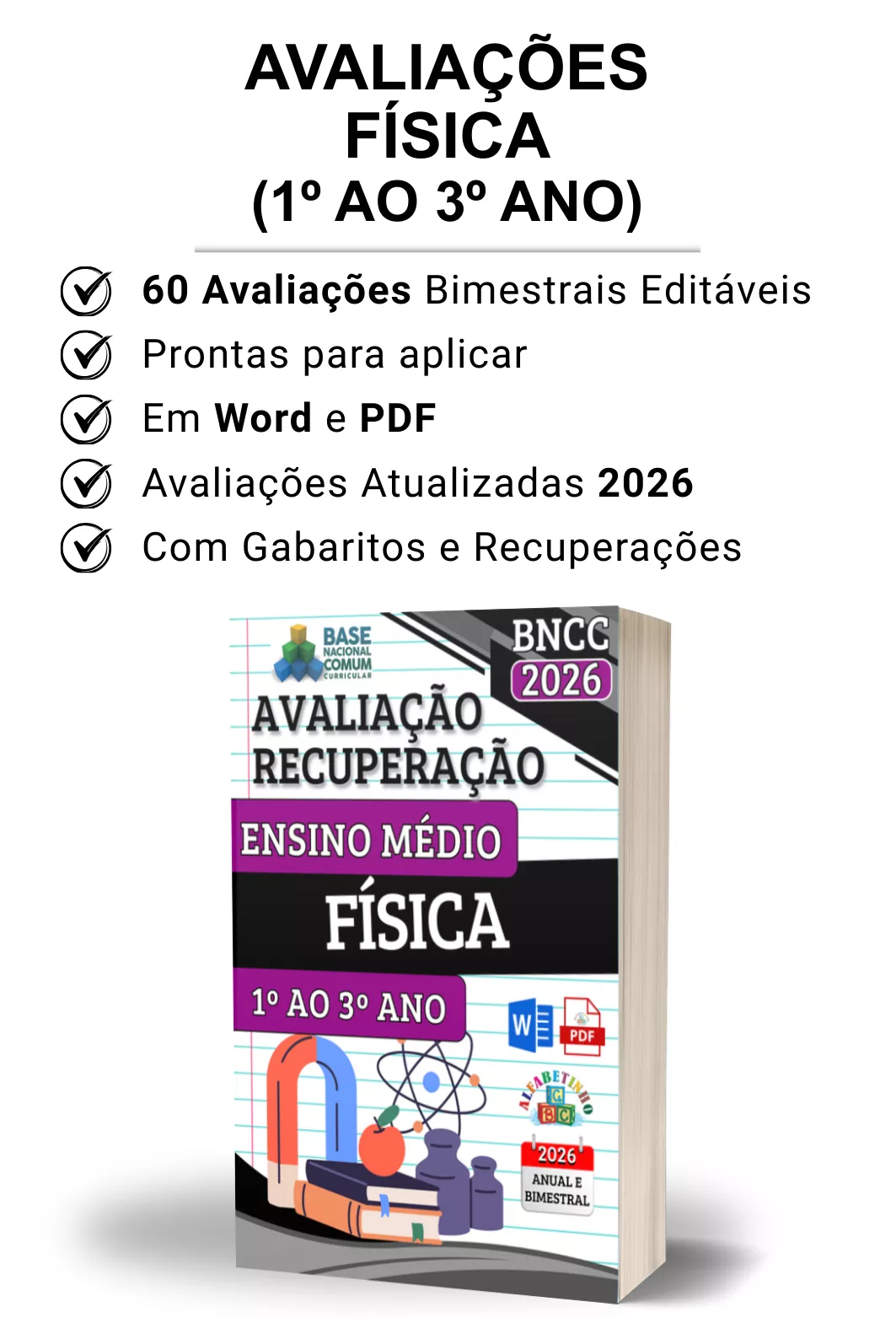 Avaliações completas, atualizadas conforme a BNCC 2026, totalmente editáveis no Word e adaptáveis à sua realidade escolar. Praticidade, qualidade e inspiração para professores que amam ensinar!