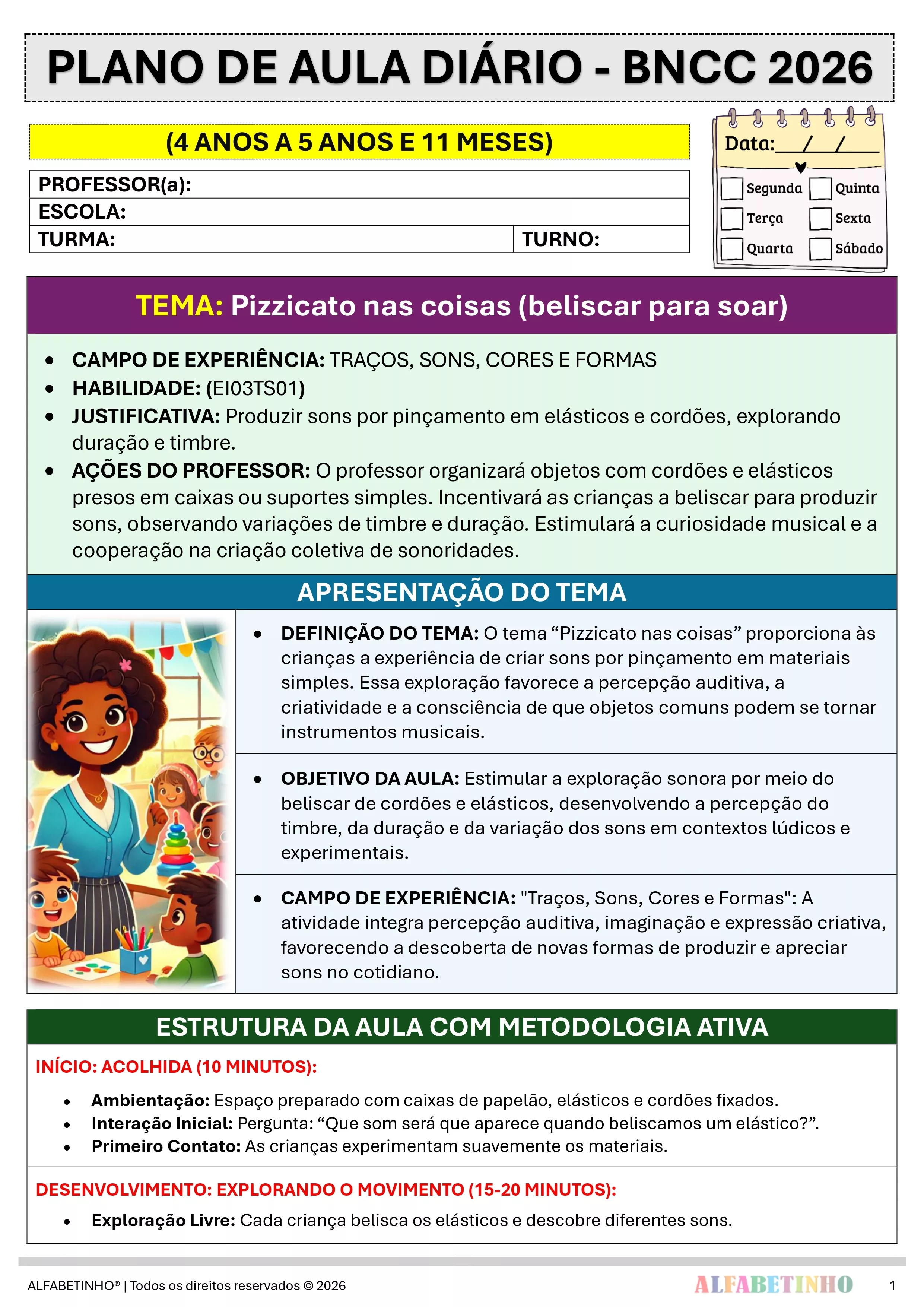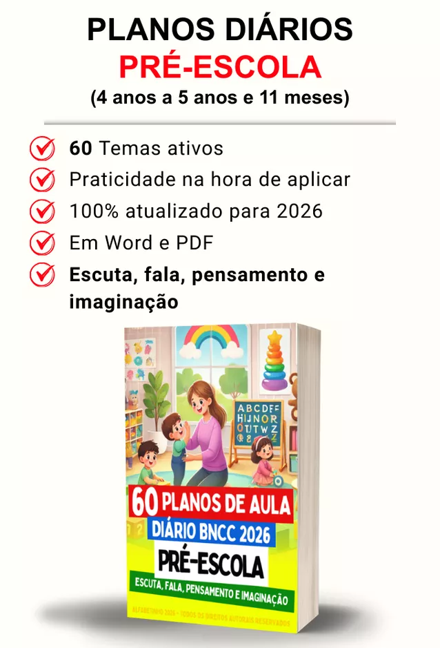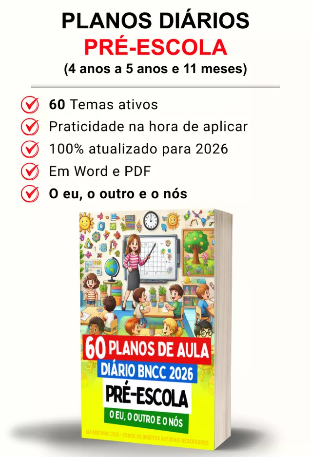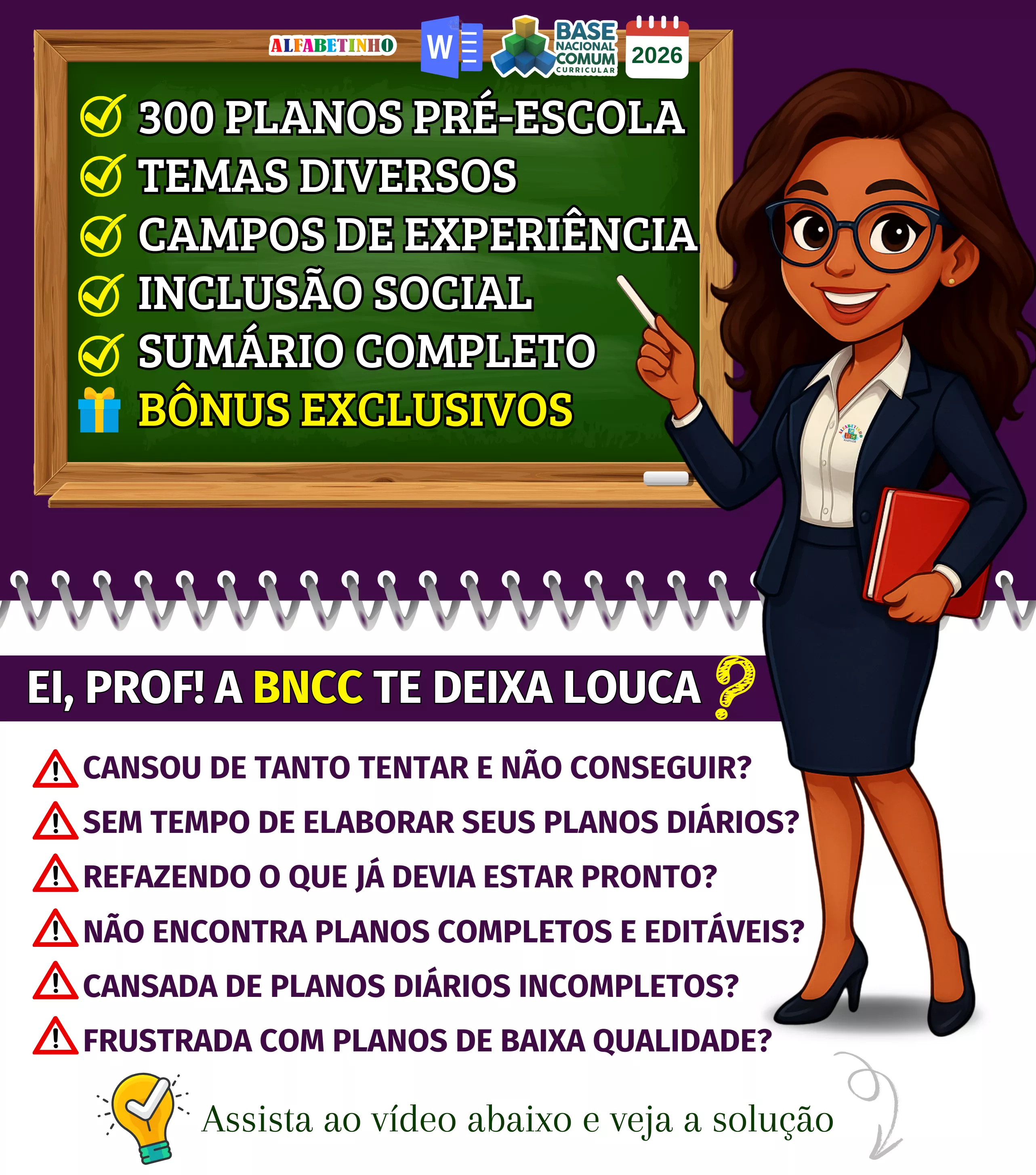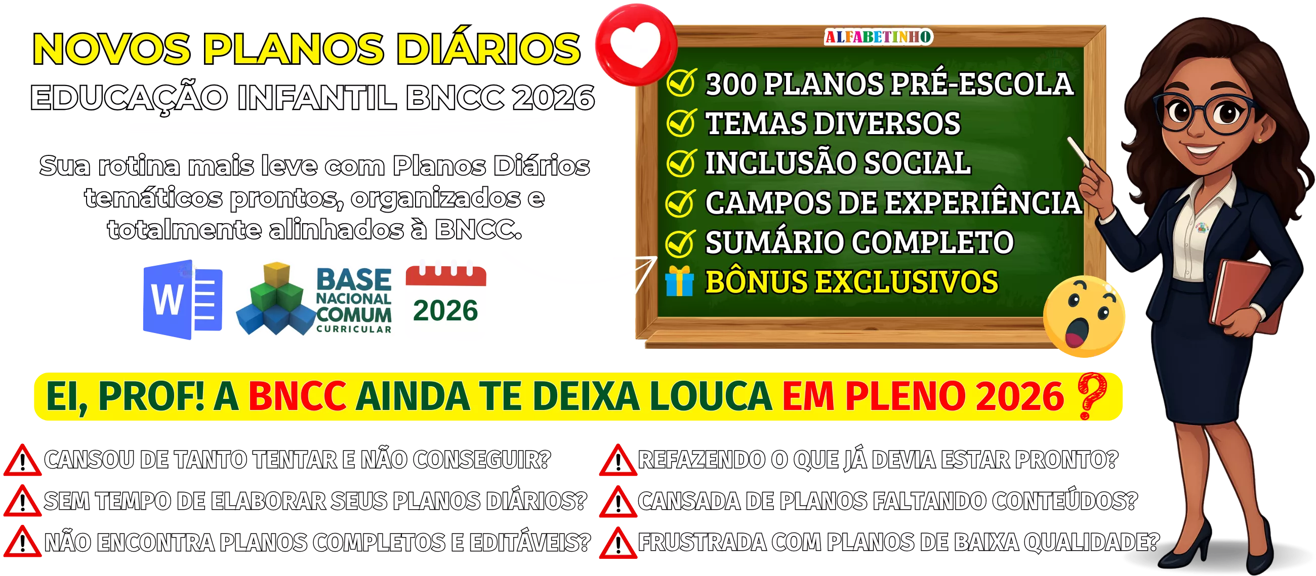 Planos Diários completos, atualizados conforme a BNCC 2026, totalmente editáveis no Word e adaptáveis à sua realidade escolar. Praticidade, qualidade e inspiração para professores que amam ensinar!